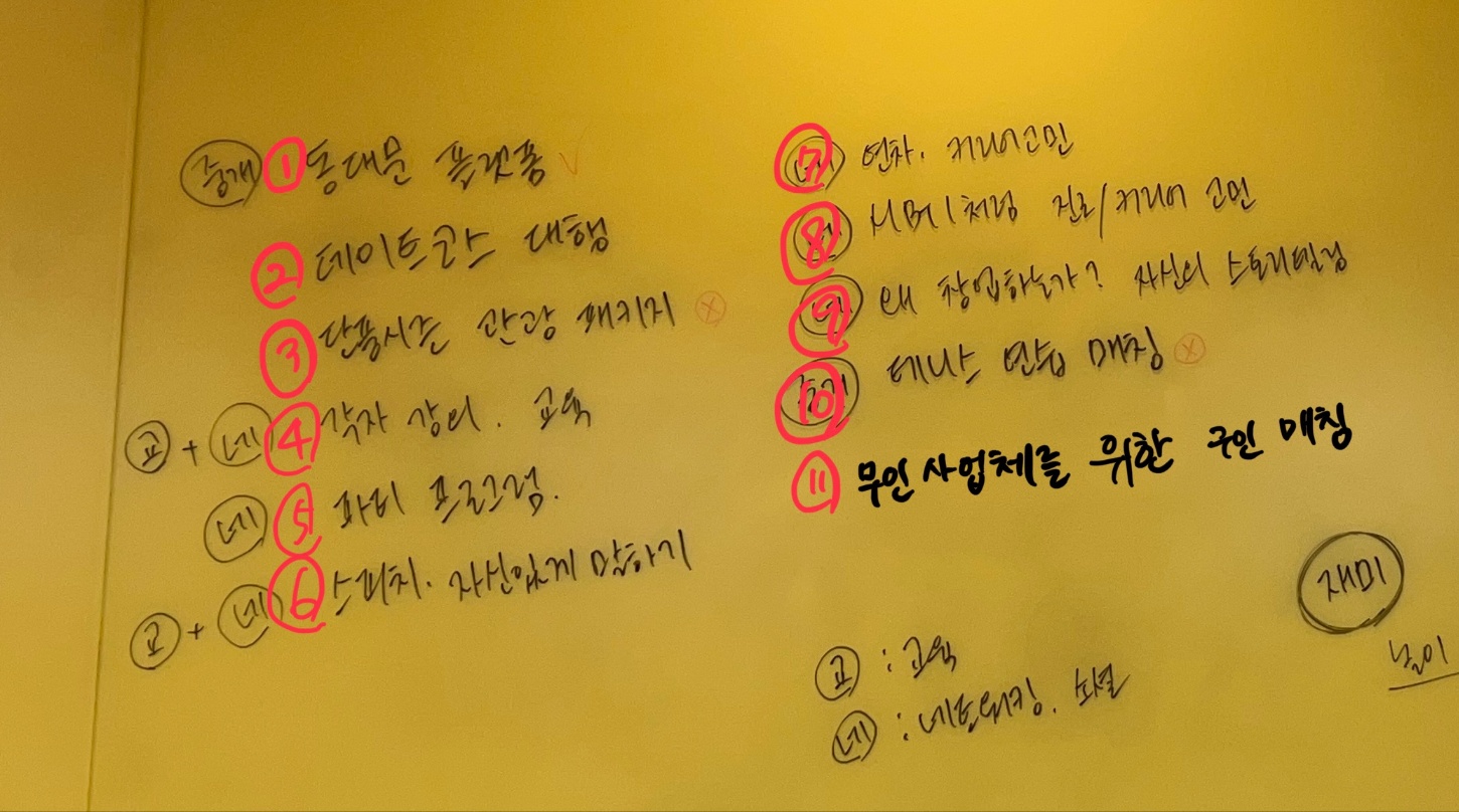 5명의 각기 다른 아이템이 나왔다. 문제는 이렇게 아이데이션 하는 건 어렵지 않지만, 이걸 합의하는 과정은 매우 어렵다는 데 있다. 각자의 아이템은 어떻게 보면 자신의 자식이나 다름없다. 그런데 그 자식을 부정하고 내 자식이 최고라고 말하는 것은 너무나 어려운 일이다. 그래서 최대한 부드럽고, 원만하게 협의를 하고자 했다.